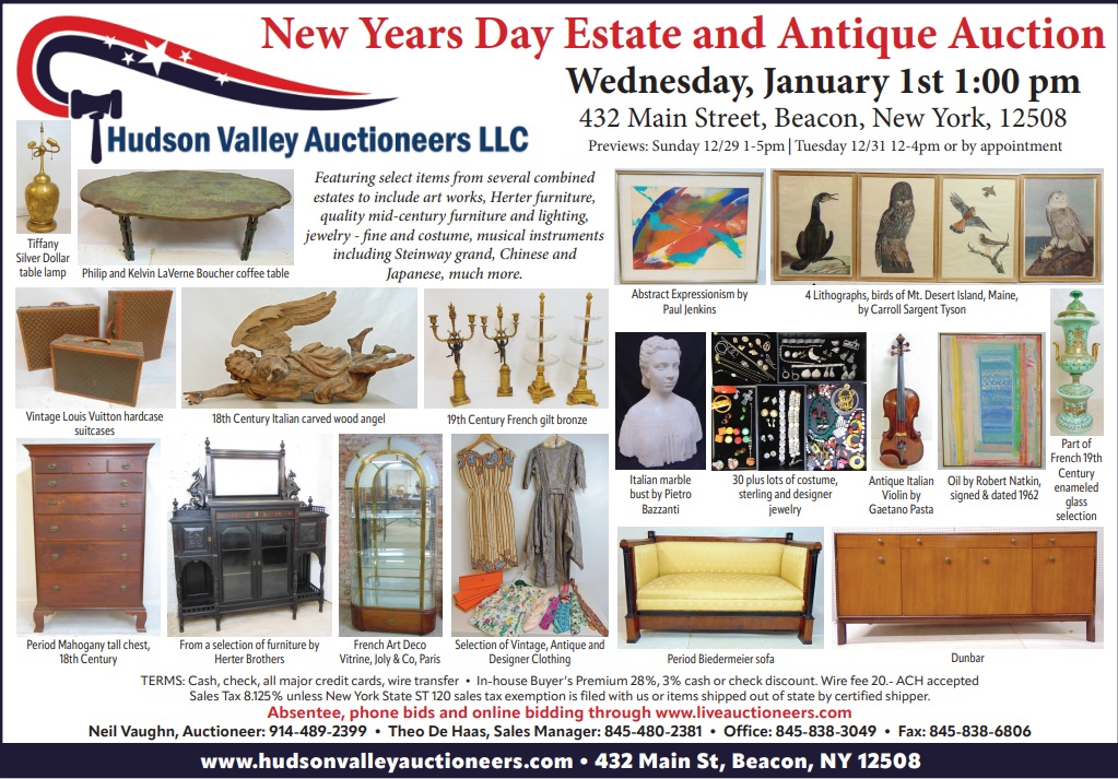 Hudson Valley Auctioneers, located at 432 Main Street, Beacon, New York will celebrate New Year's Day 2025 with an unreserved antique and estate auction selling with absentee, phone and online bidding through Liveauctioneers.com on Wednesday January 1st 1:00 PM EST.
