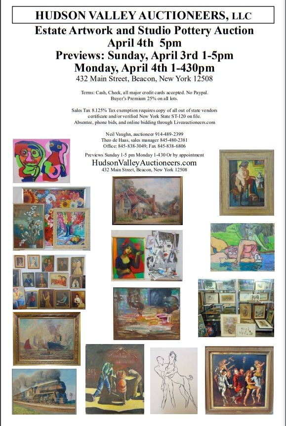 Hudson Valley Auctioneers, located at 432 Main Street, Beacon, New York will present an unreserved Art auction with absentee, phone and online bidding through Liveauctioneers.com on Monday April 4th at 5:00 PM EST.