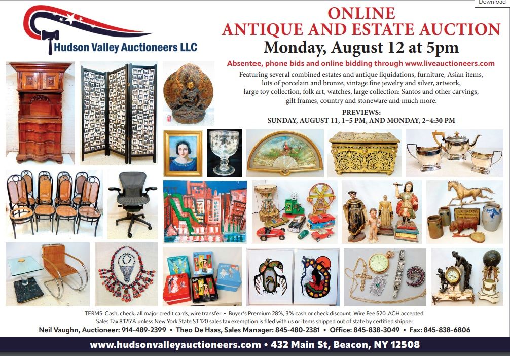 Hudson Valley Auctioneers, located at 432 Main Street, Beacon, New York will present an unreserved antique and estate auction with absentee, phone and online bidding through Liveauctioneers.com on Monday August 12 at 5:00 PM EST. In house previews are Sunday 8/11 from 1pm-5pm and Monday from 2-4:30 pm or by appointment beginning 7/29. The sale includes select items from estates in Rhinebeck, Peekskill, Brooklyn, Ho-Ho-Kus and other locales.