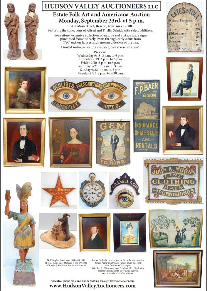 Hudson Valley Auctioneers, located at 432 Main Street, Beacon, New York will present a one owner antique and estate auction with absentee, phone and online bidding through Liveauctioneers.com on Monday September 23rd at 5:00 PM EST. featuring American Portraits and Paintings, Folk Art & Signs from the estate of Alfred Selnick.